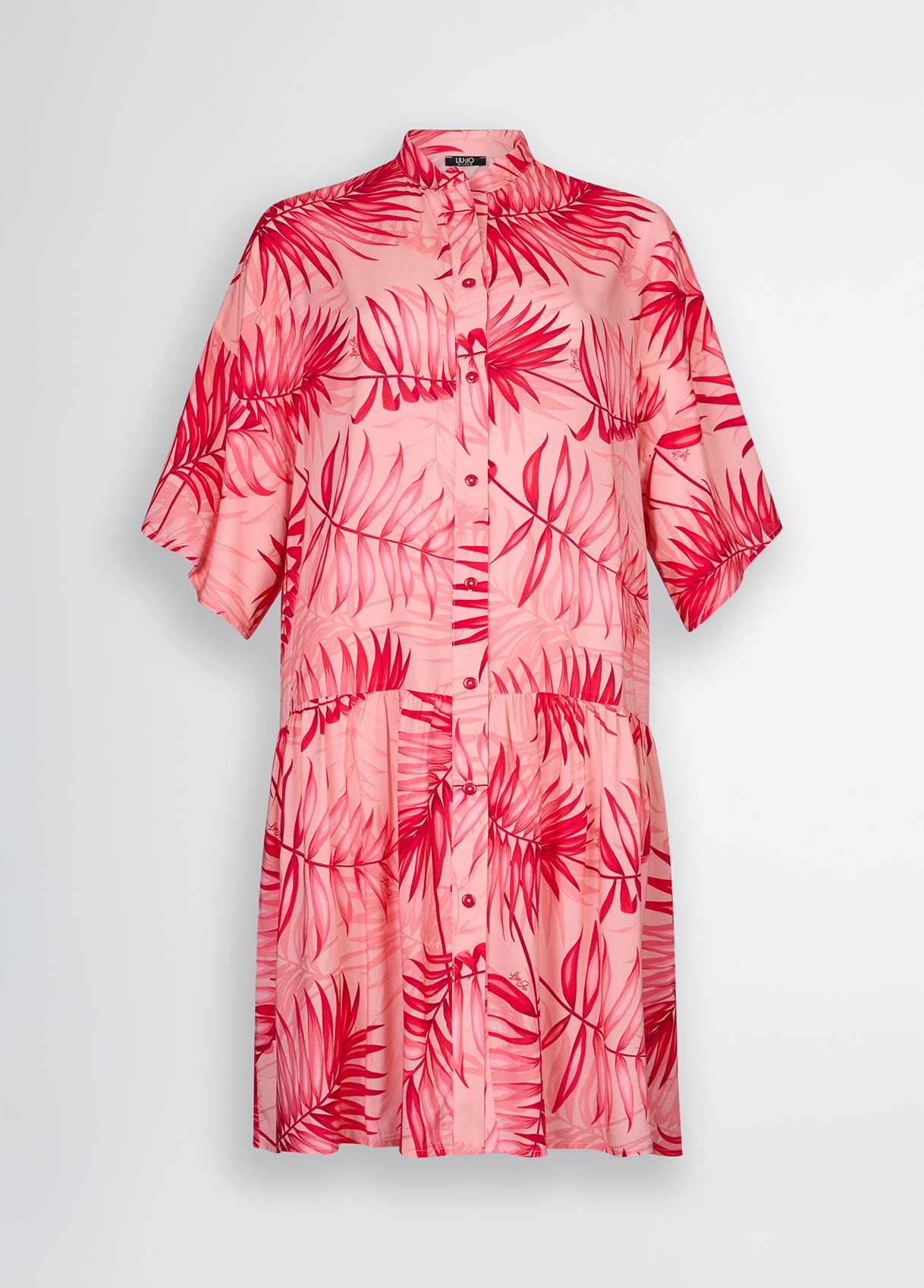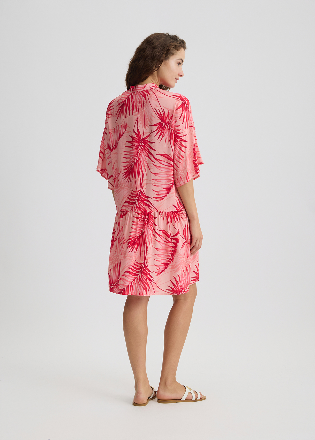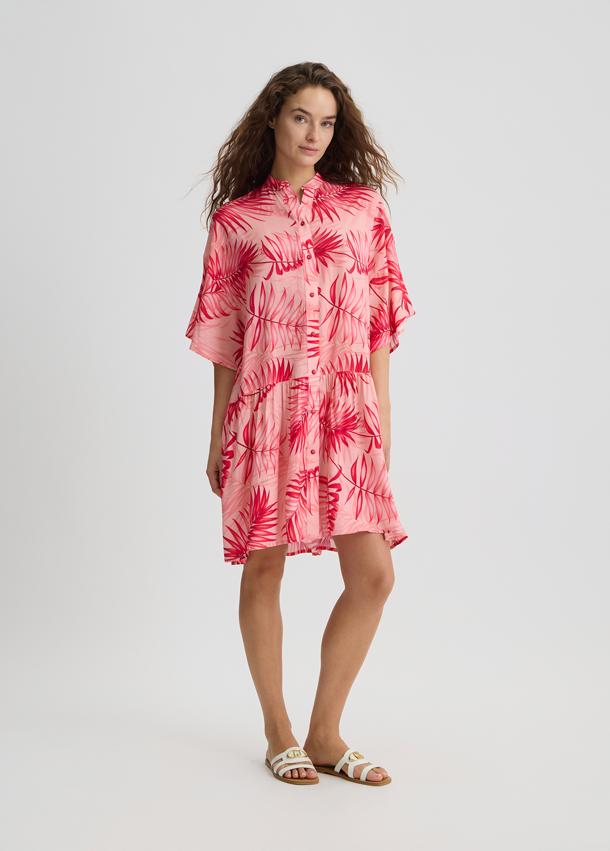 Descrizione: “Abito midi chemisier rosa Realizzato in viscosa Stampa palme all over Colletto alla coreana Maniche a 3/4 Motivo a pieghe Chiusura con bottoni”
