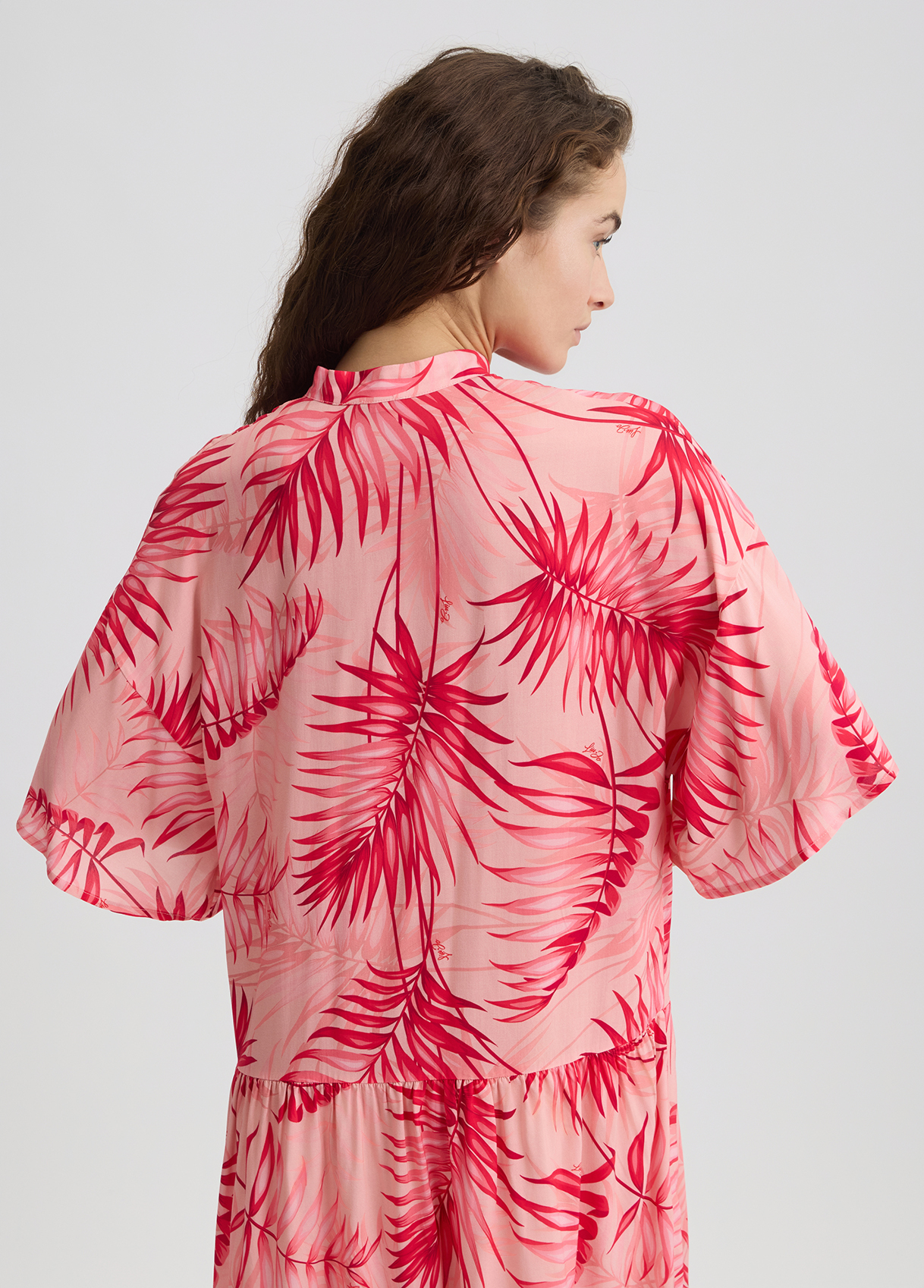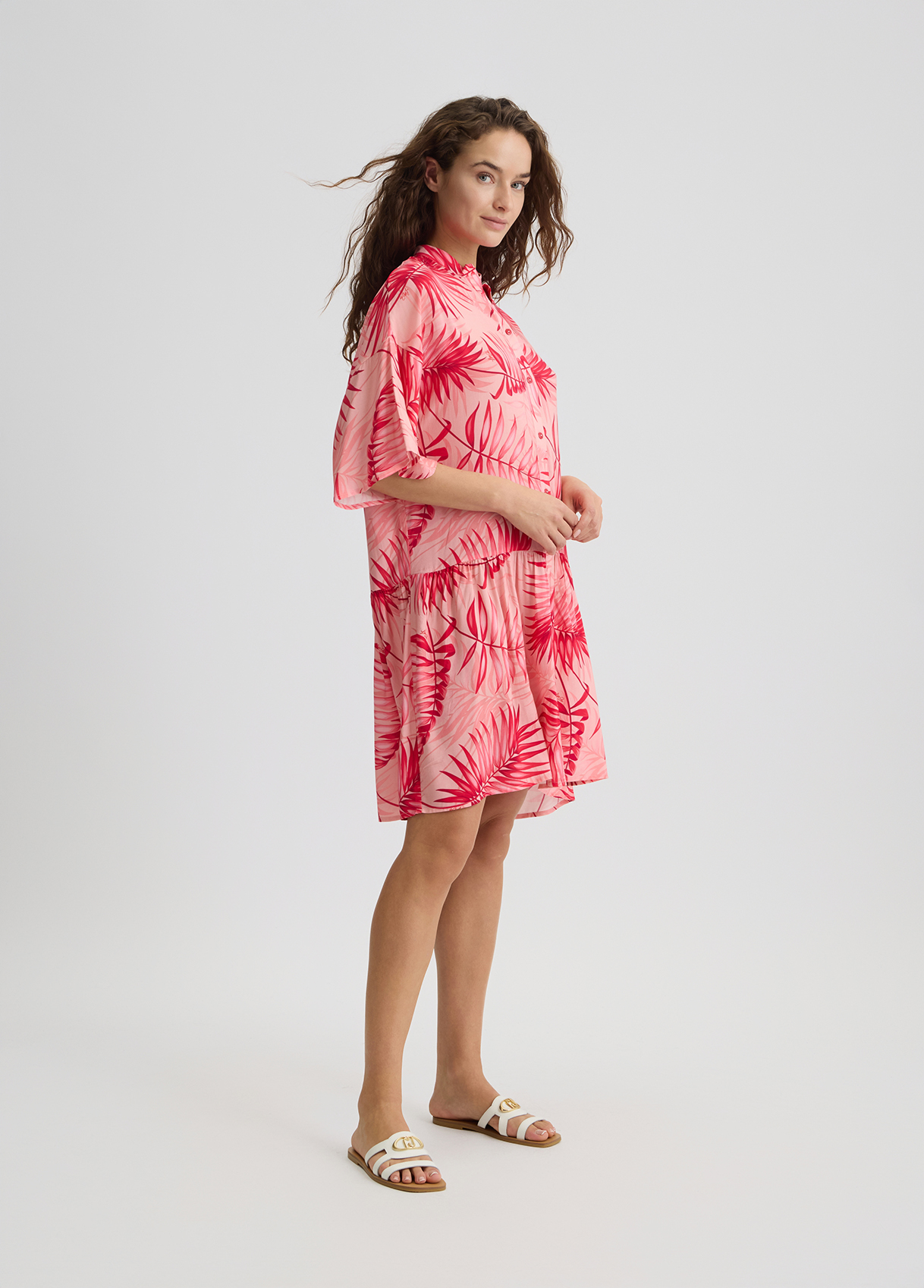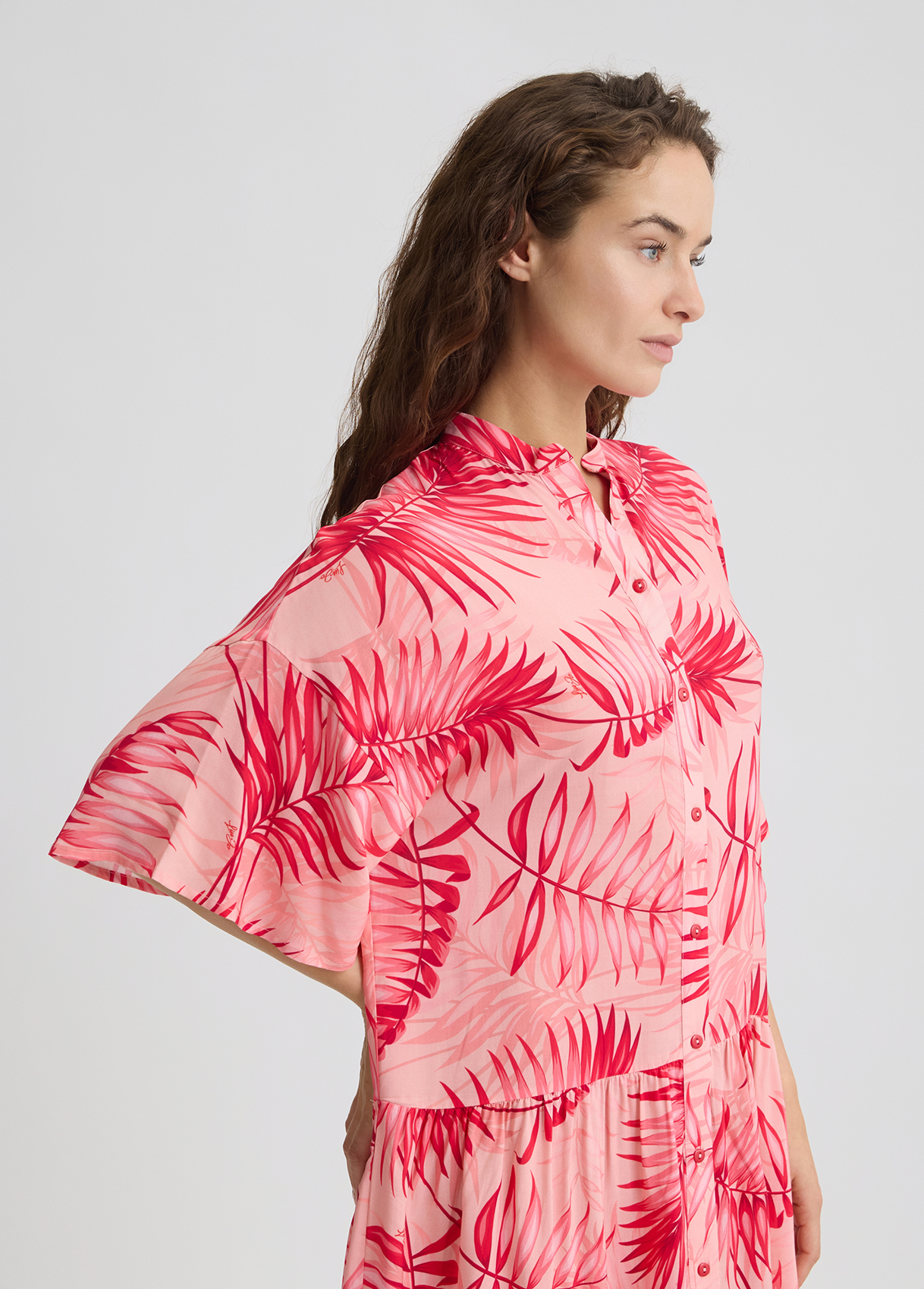 Descrizione: “Abito midi chemisier rosa Realizzato in viscosa Stampa palme all over Colletto alla coreana Maniche a 3/4 Motivo a pieghe Chiusura con bottoni”