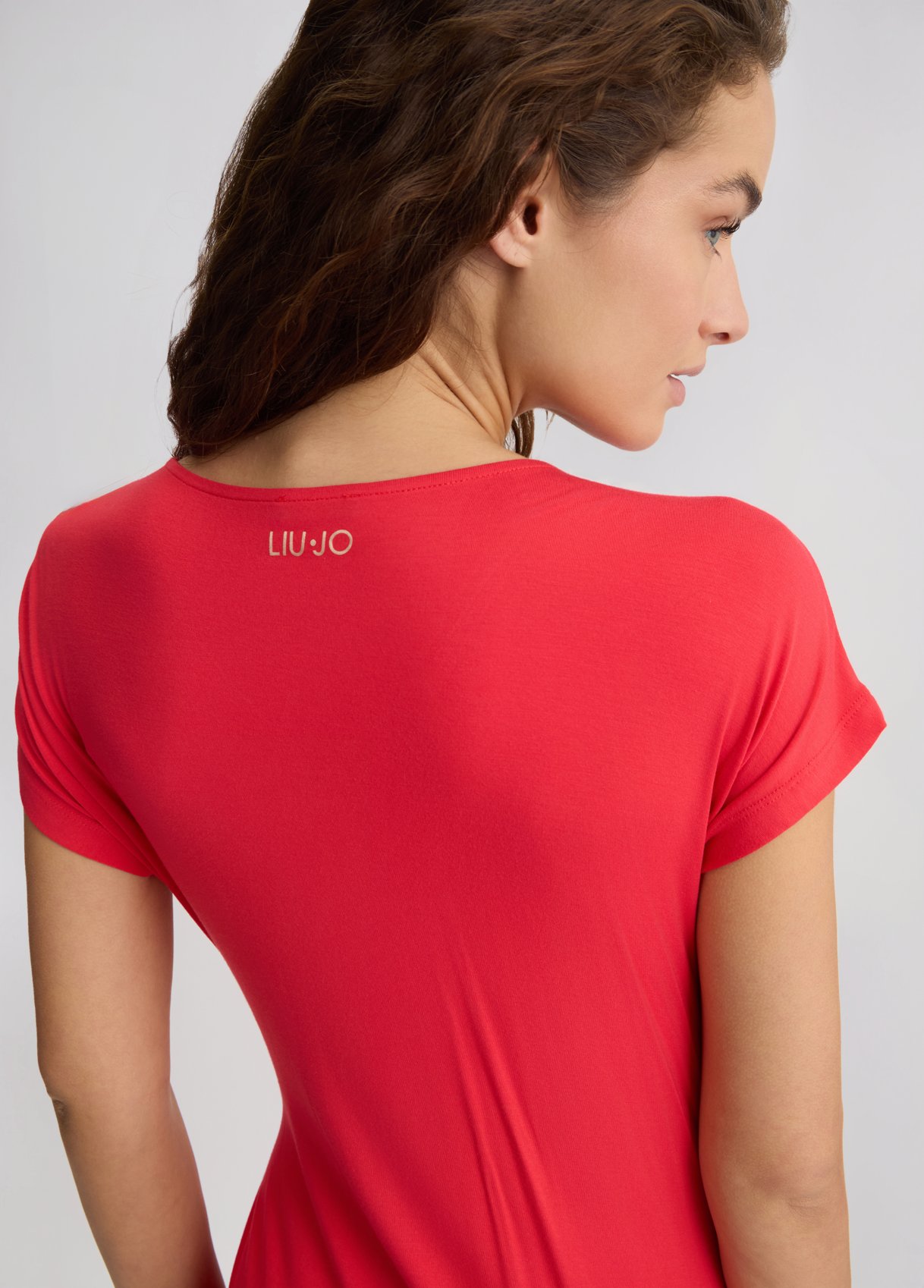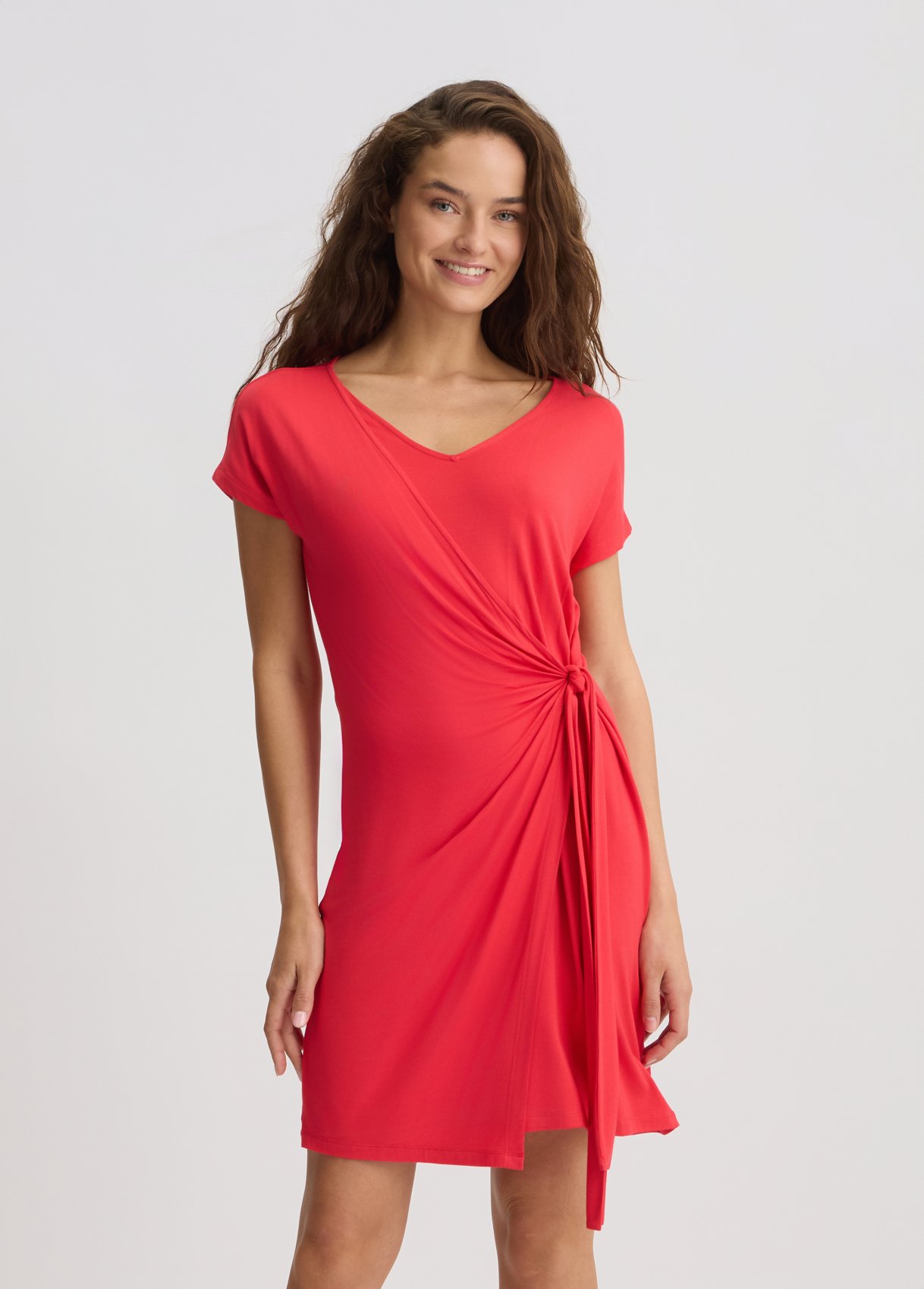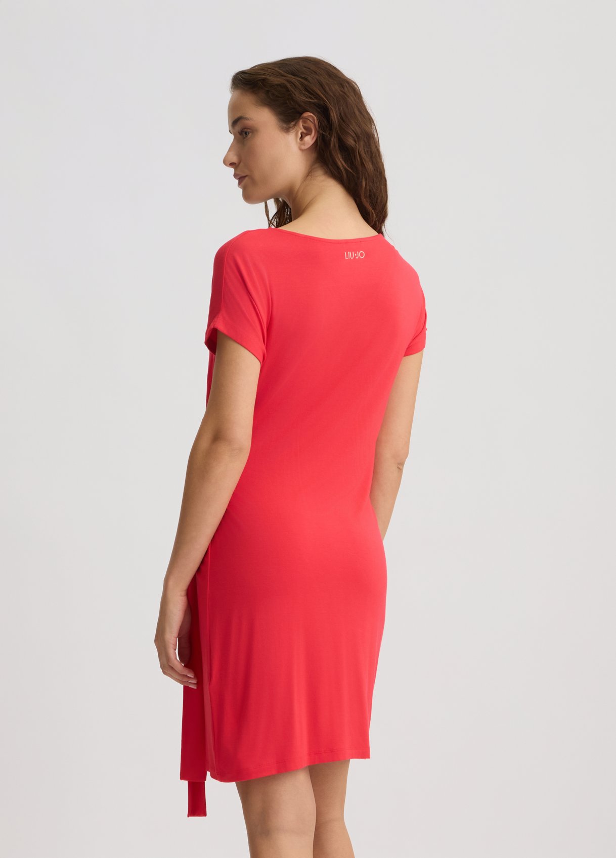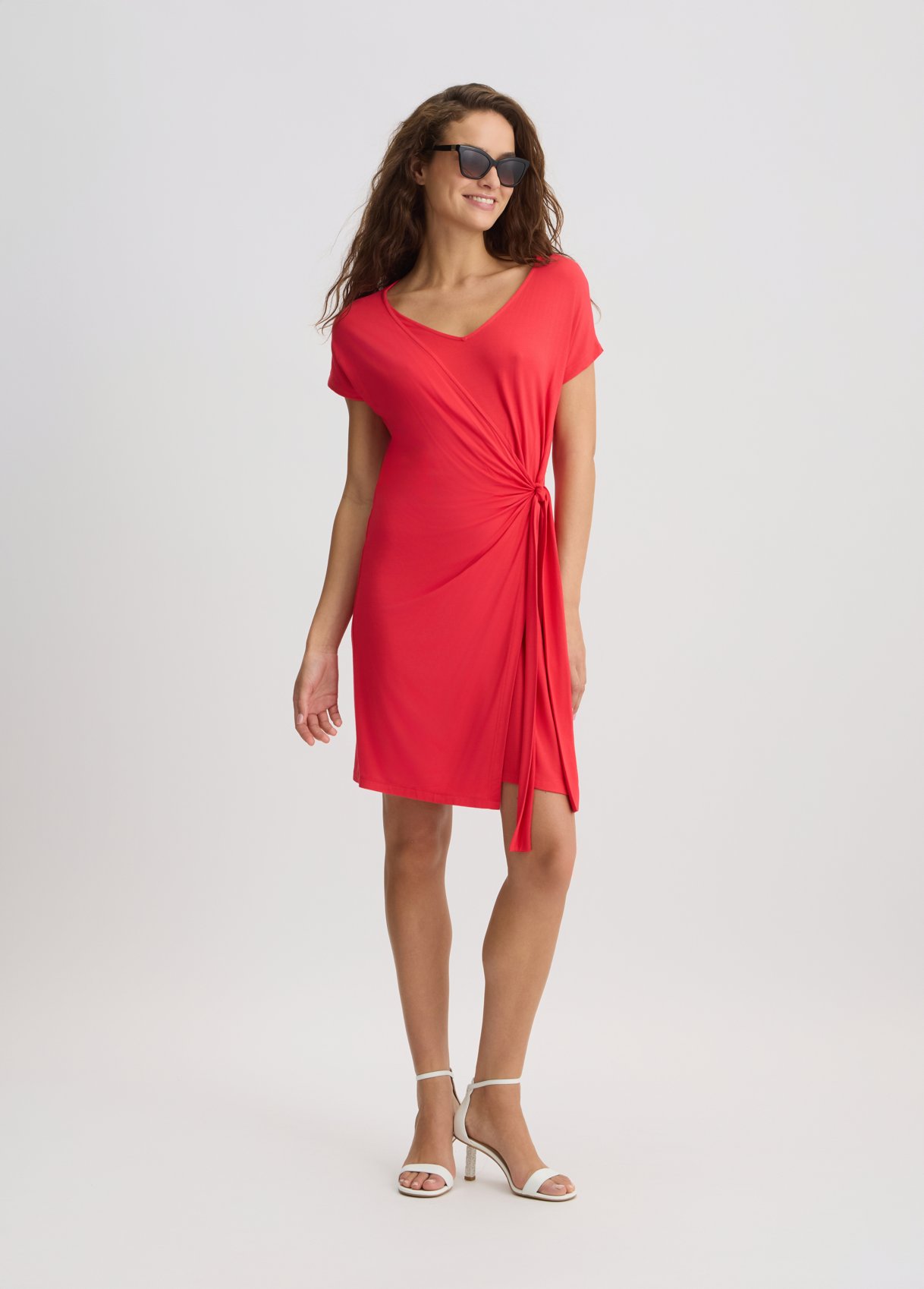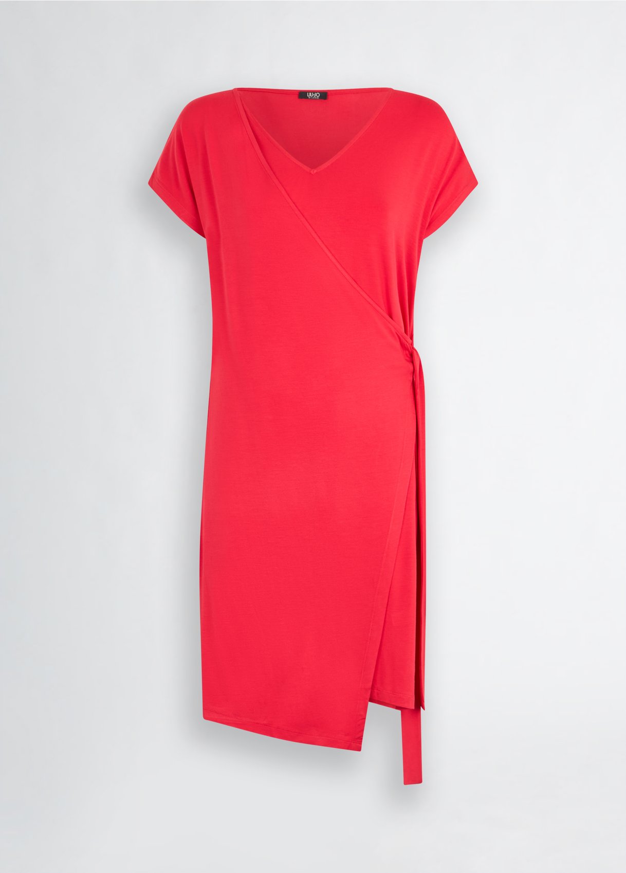 “Abito corto in jersey di viscosa stretch Design a portafoglio Scollo a V Maniche corte Fiocco che si allaccia sul fianco Stampa logo sul retro Orlo asimmetricoX La modella è alta 178 cm e indossa la taglia S “