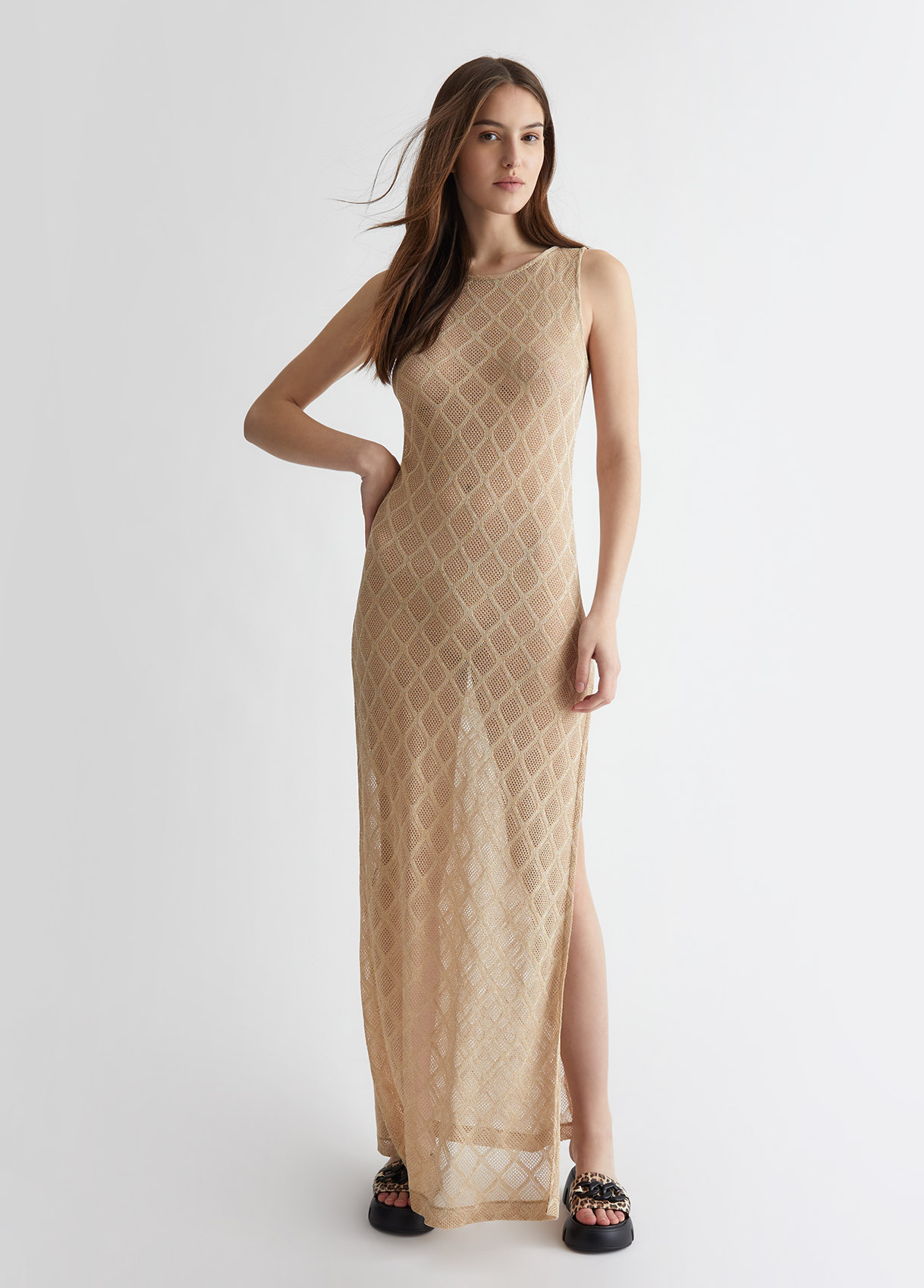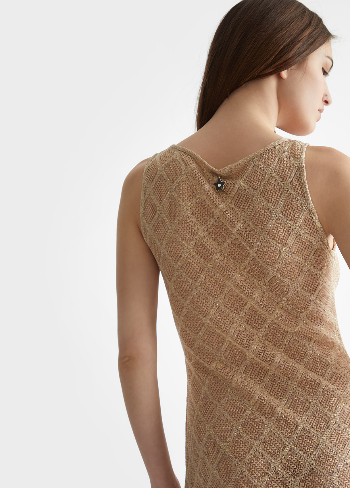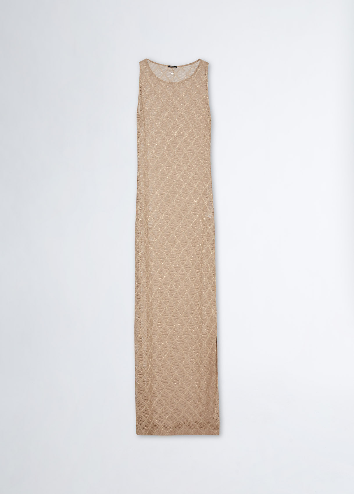 Abito in maglia di viscosa e lurex Lavorazione a rombi Scollo a barca Sorretto da spalline larghe Spacco laterale Logo in metallo sul retro Made in Italy