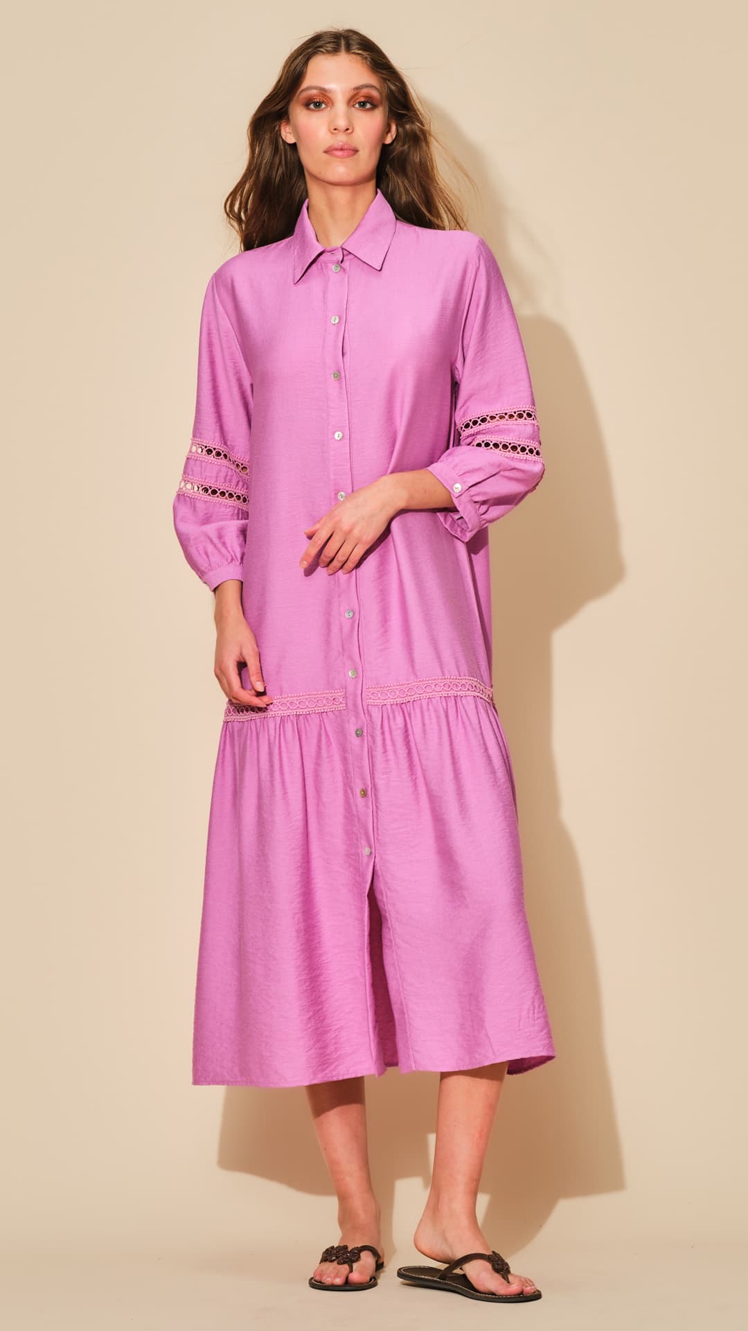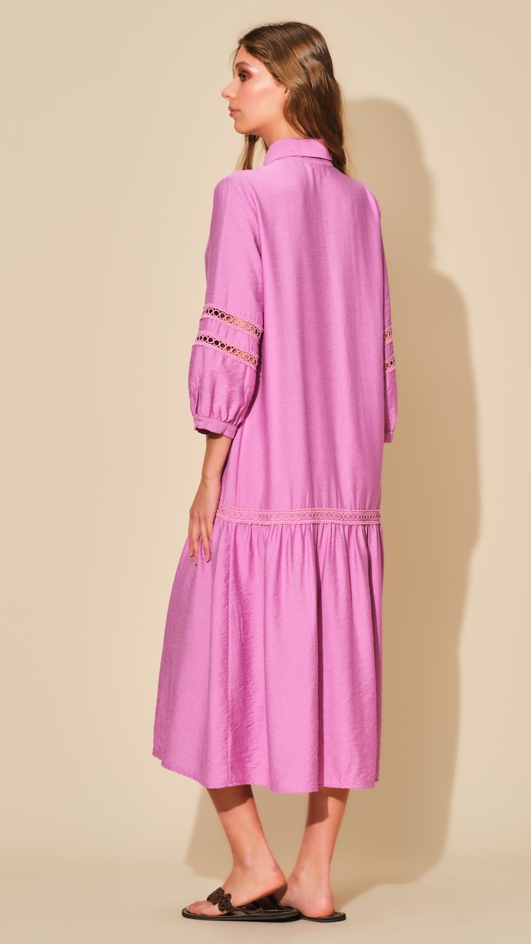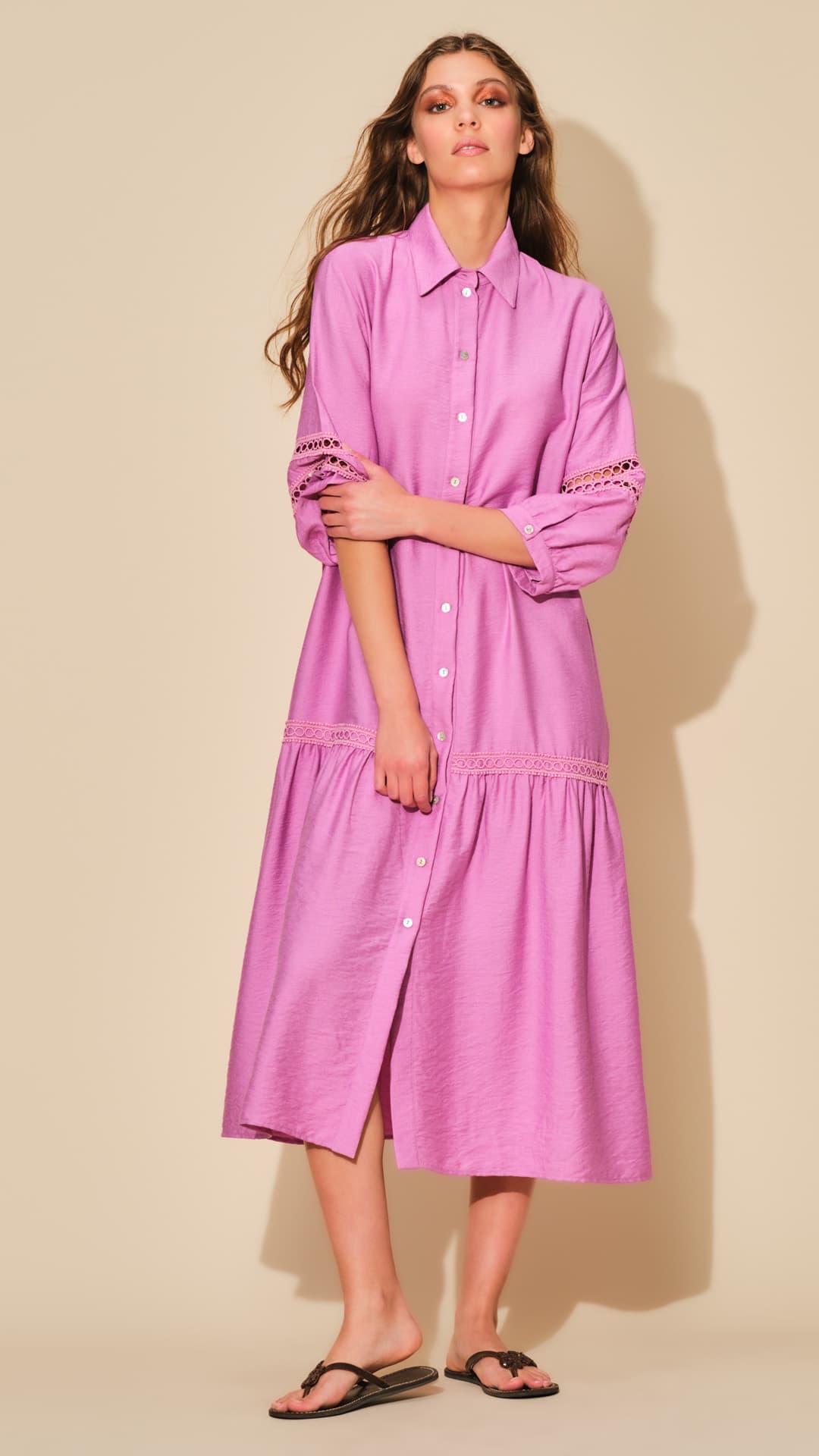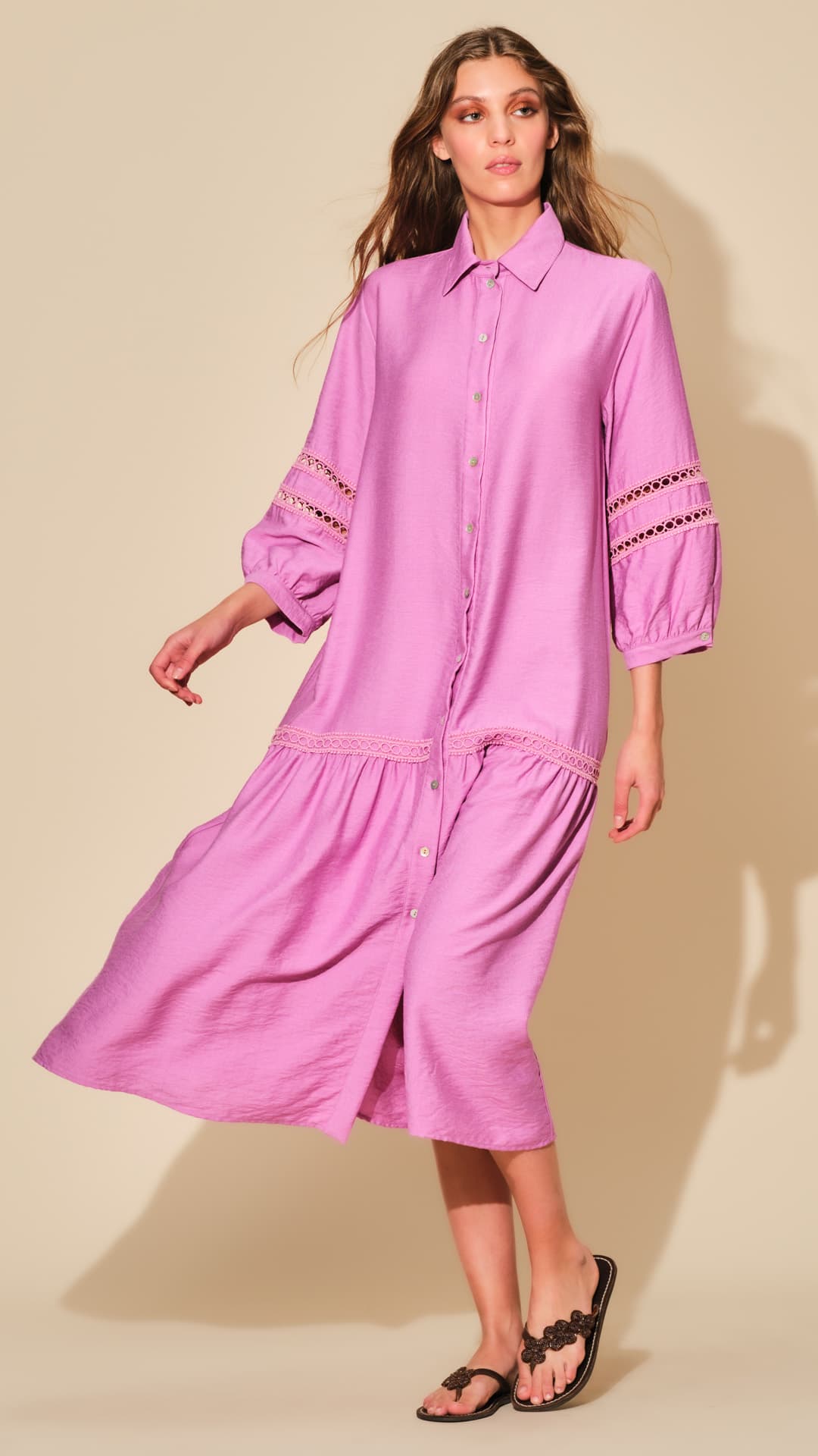 “Abito lungo estivo da donna realizzato in tessuto di viscosa effetto lucido con maniche decorate in picco macramè.