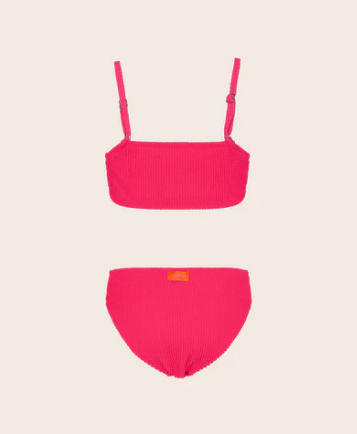 “Bikini bambina con top e slip fisso in lycra goffrata, capo dotato di spalline regolabili Composizione: 93% PL e 7% EA Lavaggio: si consiglia lavaggio a mano in acqua tiepida”