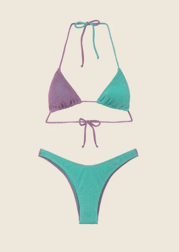 “Bikini con triangolo e slip americano fisso in lurex, capo dotato di imbottitura interna estraibile Taglia: la modella è alta 172cm e indossa una taglia S Composizione: 77% PL, 17% MTL e 6% EA Lavaggio: si consiglia lavaggio a mano in acqua tiepida”