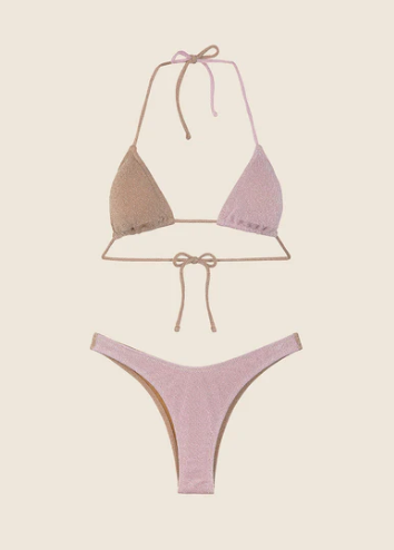“Bikini con triangolo e slip americano fisso in lurex, capo dotato di imbottitura interna estraibile Taglia: la modella è alta 172cm e indossa una taglia S Composizione: 77% PL, 17% MTL e 6% EA Lavaggio: si consiglia lavaggio a mano in acqua tiepida”