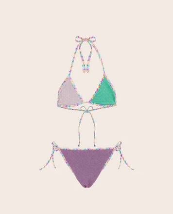 Descrizione: “Bikini con triangolo e slip fisso fantasia, bordato in lycra