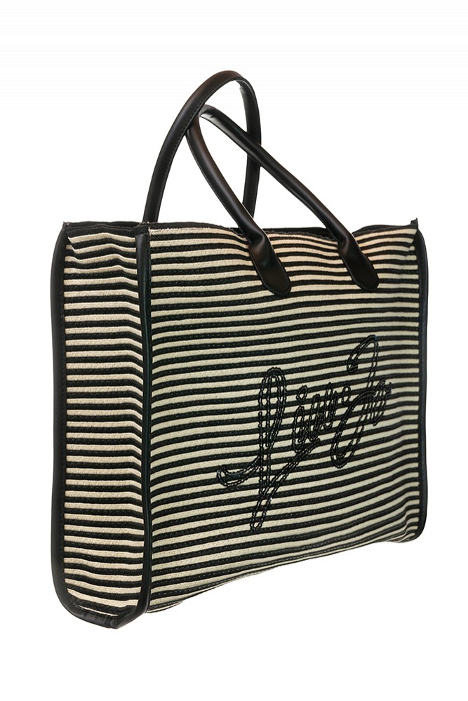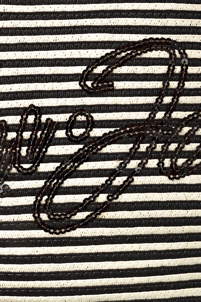 Descrizione: Borsa mare Liu Jo a righe panna e nero, modello shopping in paglia, logo centrale con applicazioni paillettes. Chiusura con cerniera. La borsa presenta comodi manici in tessuto spalmato e misura 46 x 33 cm. Nuova collezione accessori beachwear Liu Jo donna estate 2024.