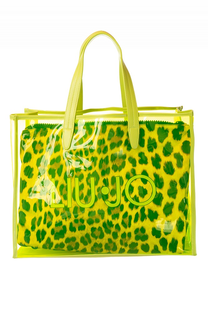BORSA – LIU JO Shopper in originale plastica trasparente fluo con manici con al suo interno mega pochette animalier con cerniera e logo Liu Jo fluo come l’esterno Composizione della borsa : 100%pvc Dimensioni:34x43x19cm Composizione della pochette interna: 100%poliestere dimensioni:37x42x18cm