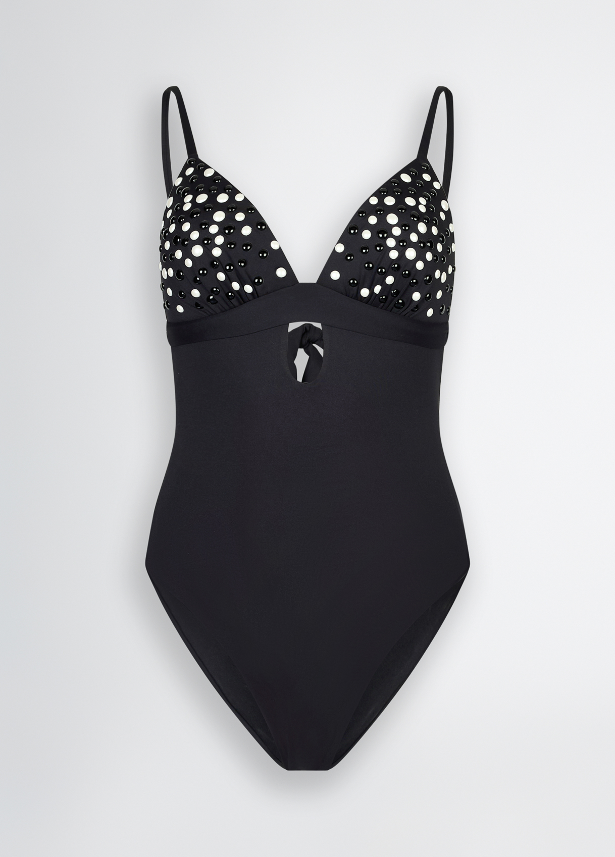 “Il nero si illumina di eleganti perle black & white trasformando questo costume intero in un must-have per la tua estate. Perfetto per un aperitivo a bordo piscina, un weekend in una spa esclusiva o per una giornata al mare. Costume intero da mare Realizzato in tessuto stretch Perle applicate sul davanti Top a triangolo con laccetti sul retro “