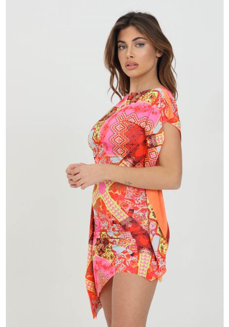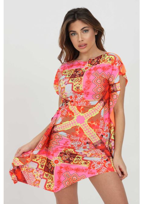 Descrizione: “Fuoriacqua copricostume donna rosa multicolor f**k corto con stampa fantasy e fusciacca laterale.