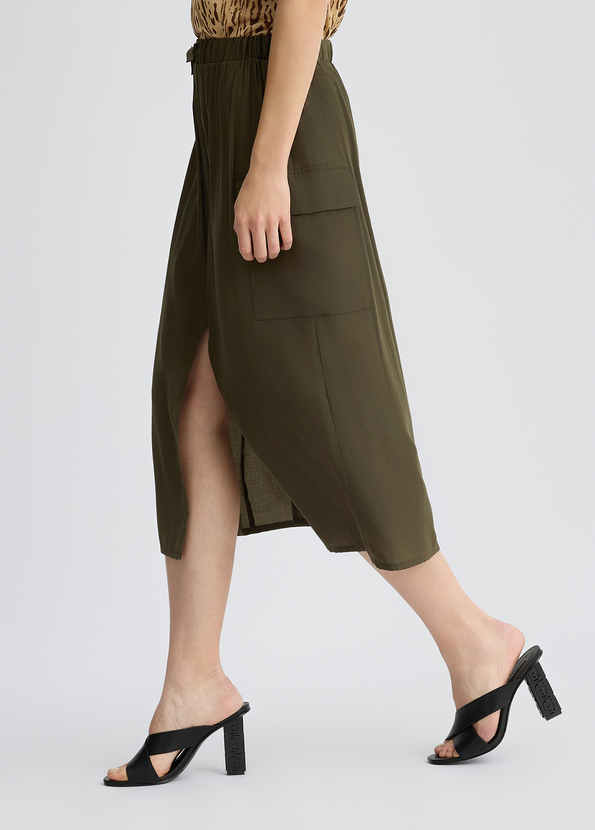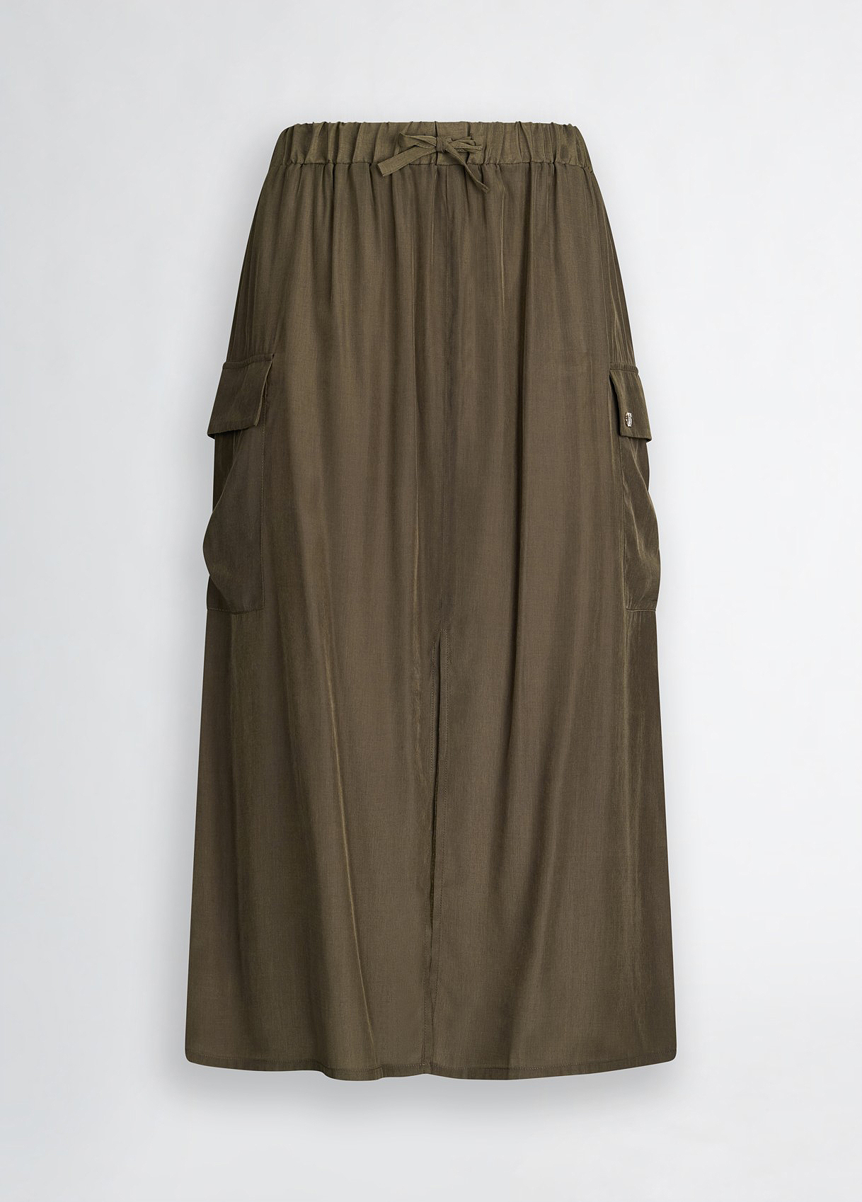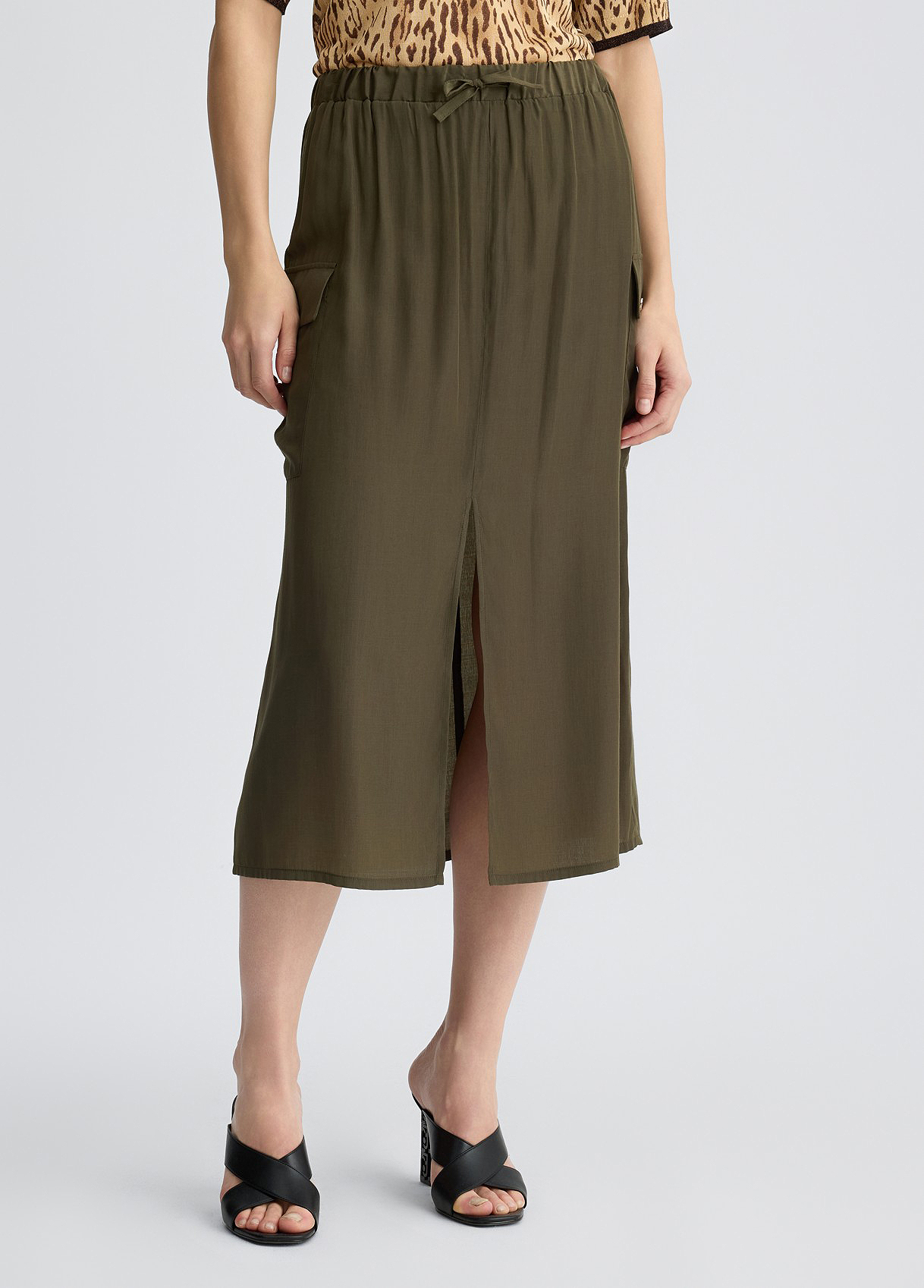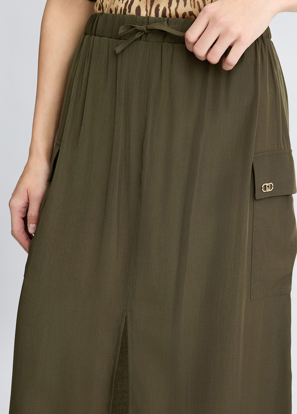 Descrizione: “Gonna longuette in tessuto fluido di misto viscosa Cintone elastico con coulisse in vita Tasche cargo con patta sui lati Spacco sul davanti Lettering LJ in metallo La modella è alta 178 cm e indossa la taglia S Tessuto principale: 57% Poliestere, 43% Viscosa”