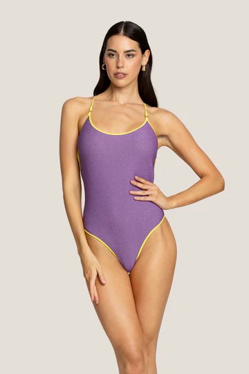 Descrizione: “Costume intero con bordature bicolor in lurex”