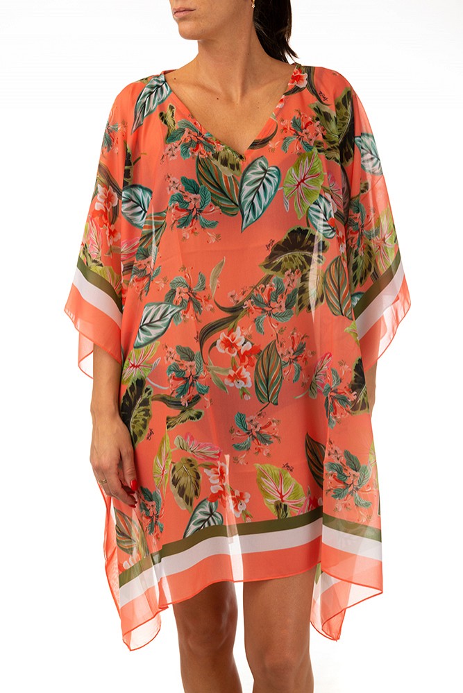 Kaftano in leggero Chiffon stampato a fantasia tigrata con bordi a contrasto. Taglio asimmetrico modello poncho con scollatura a V.