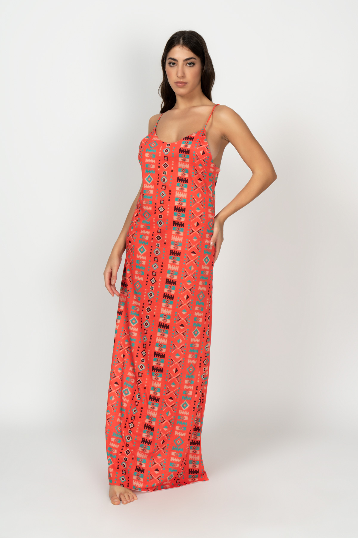 “Fuori acqua, collezione SS22 del Mood South Central. Vestito donna lungo, in tessuto jersey a fantasia. Capo con spacco laterale.