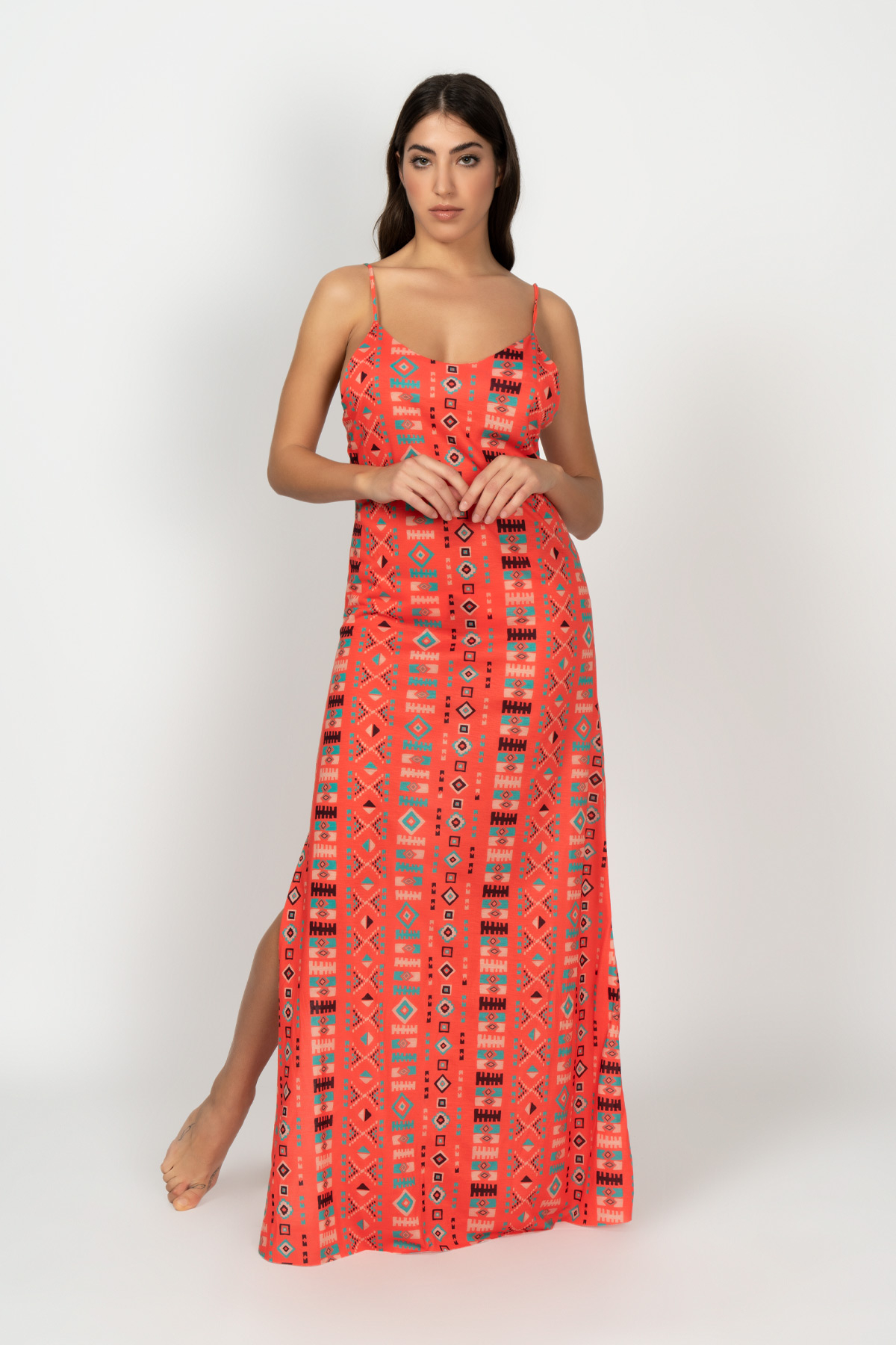Descrizione: “Fuori acqua, collezione SS22 del Mood South Central. Vestito donna lungo, in tessuto jersey a fantasia. Capo con spacco laterale.