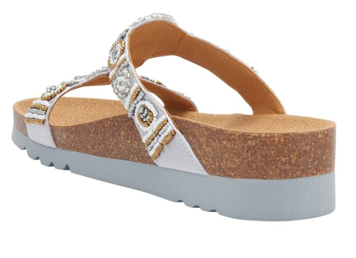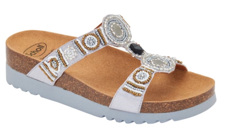 Bogotà è il sandalo senza cinturino caratterizzato dal plantare con tecnologia Scholl Bioprint® in sughero naturale e gomma ergonomicamente disegnato per mantenere il piede nella giusta posizione.