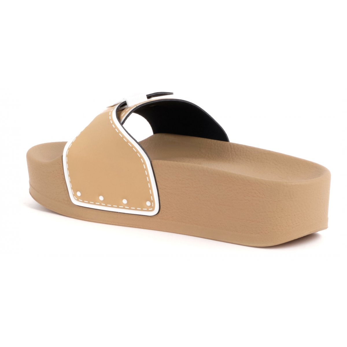 Descrizione: “Pescura Mood Wedge è la nostra nuova interpretazione di Pescura, realizzata in PUSP e LYCRA, con un’altezza di 5 cm. La fibbia permette di regolare la chiusura.