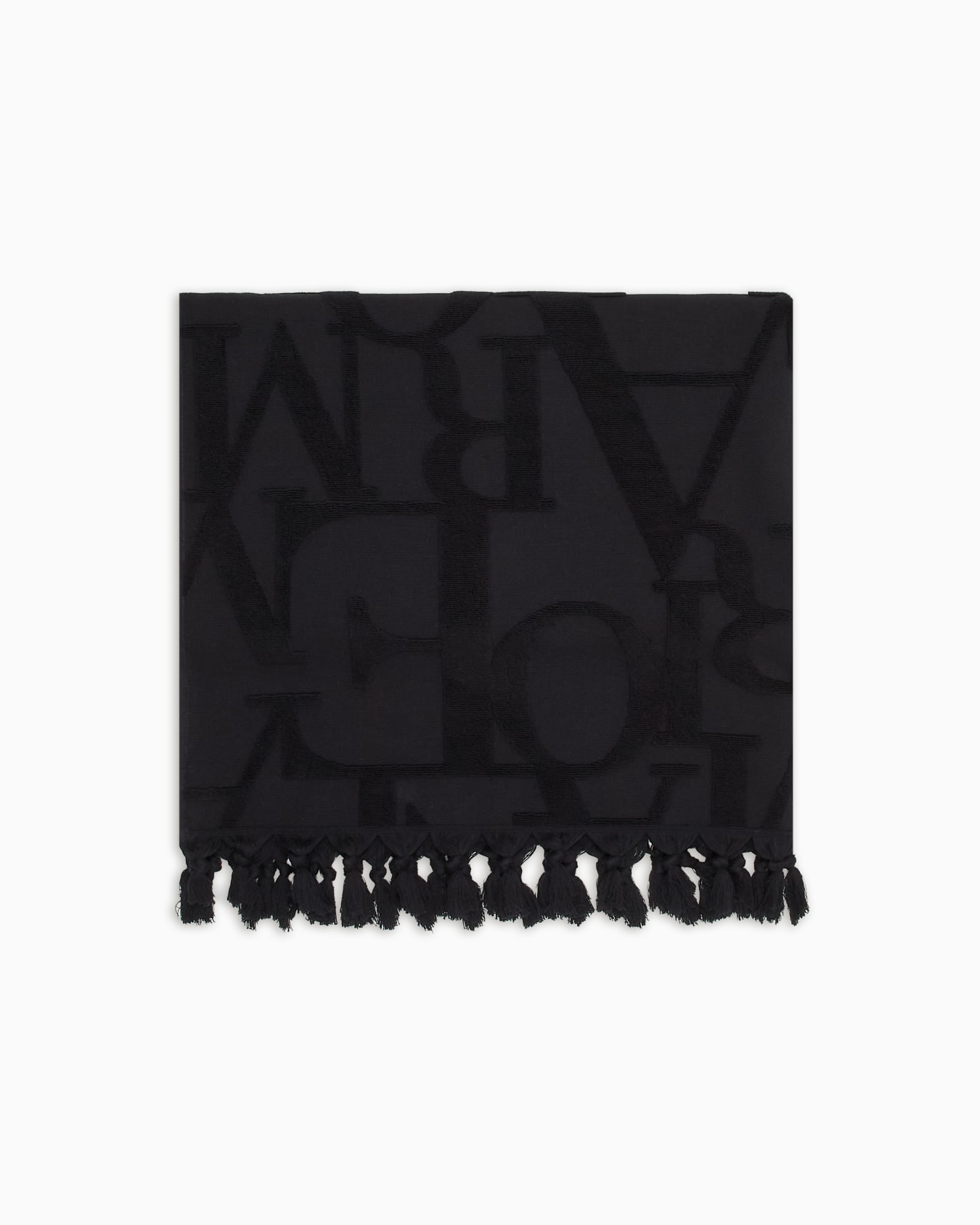 “Telo mare realizzato in spugna di puro cotone, caratterizzato da logo lettering all over a rilievo dal finish spugnoso e ad effetto tridimensionale.