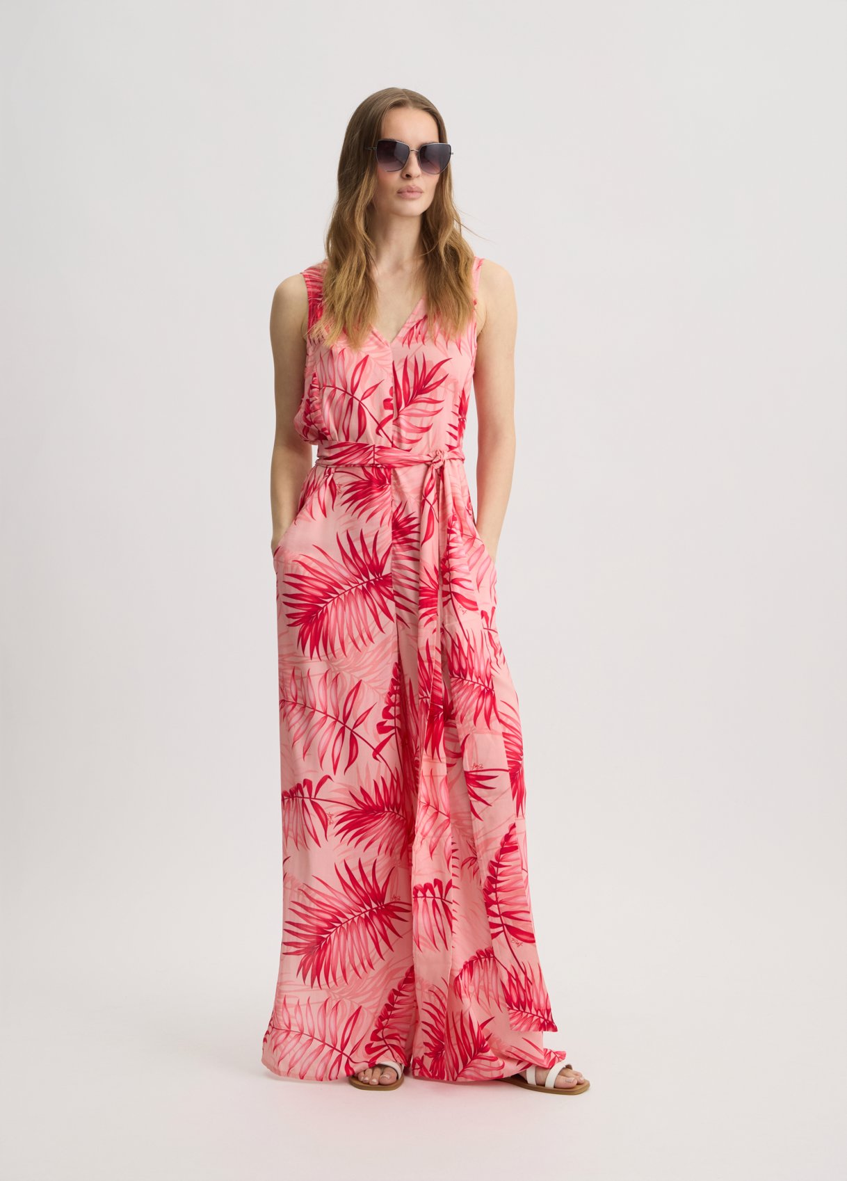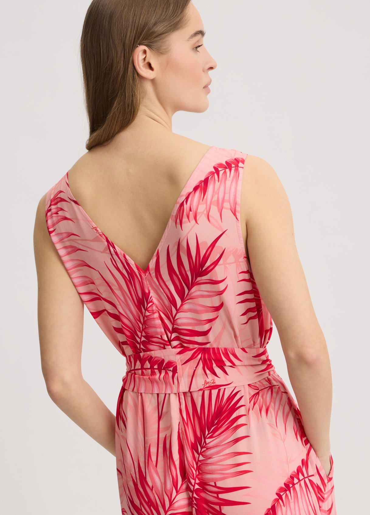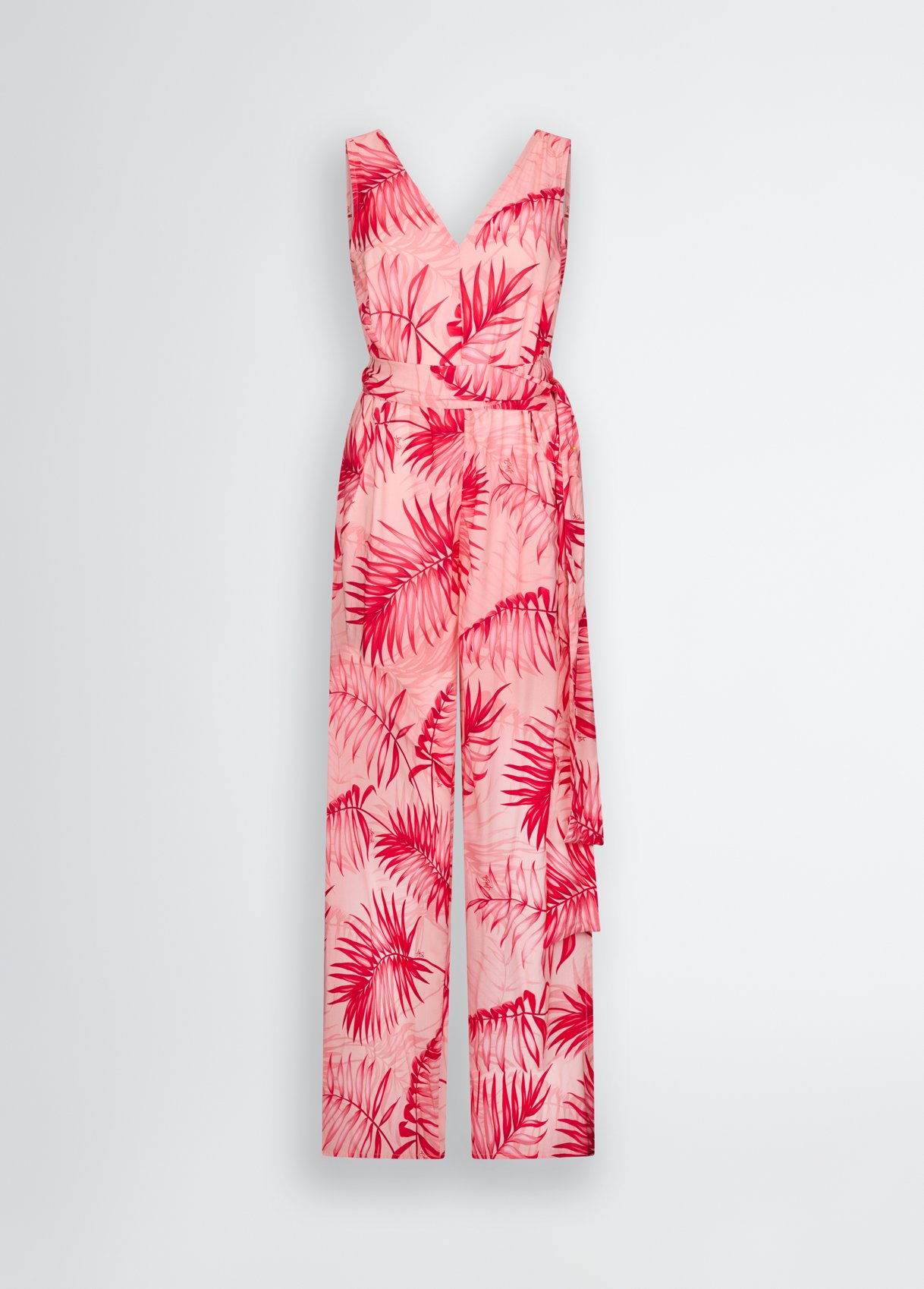 “Tuta in viscosa Stampa tropicale all over Scollo a V Sorretto da spalline larghe Tasche sui fianchi Cintura sur ton in abbinamento rnComposizione: Tessuto principale: 100% Viscosa rnLavare delicatamente max 30u00b0C| Non trattare con cloro| Non usare asciugatrice| Stirare a temperatura massima 110 u00b0C| Non lavare a secco| Lavare con colori similari| Lavare a rovescio| Stirare a rovescio “