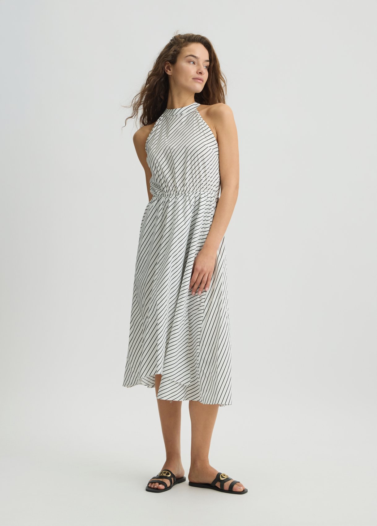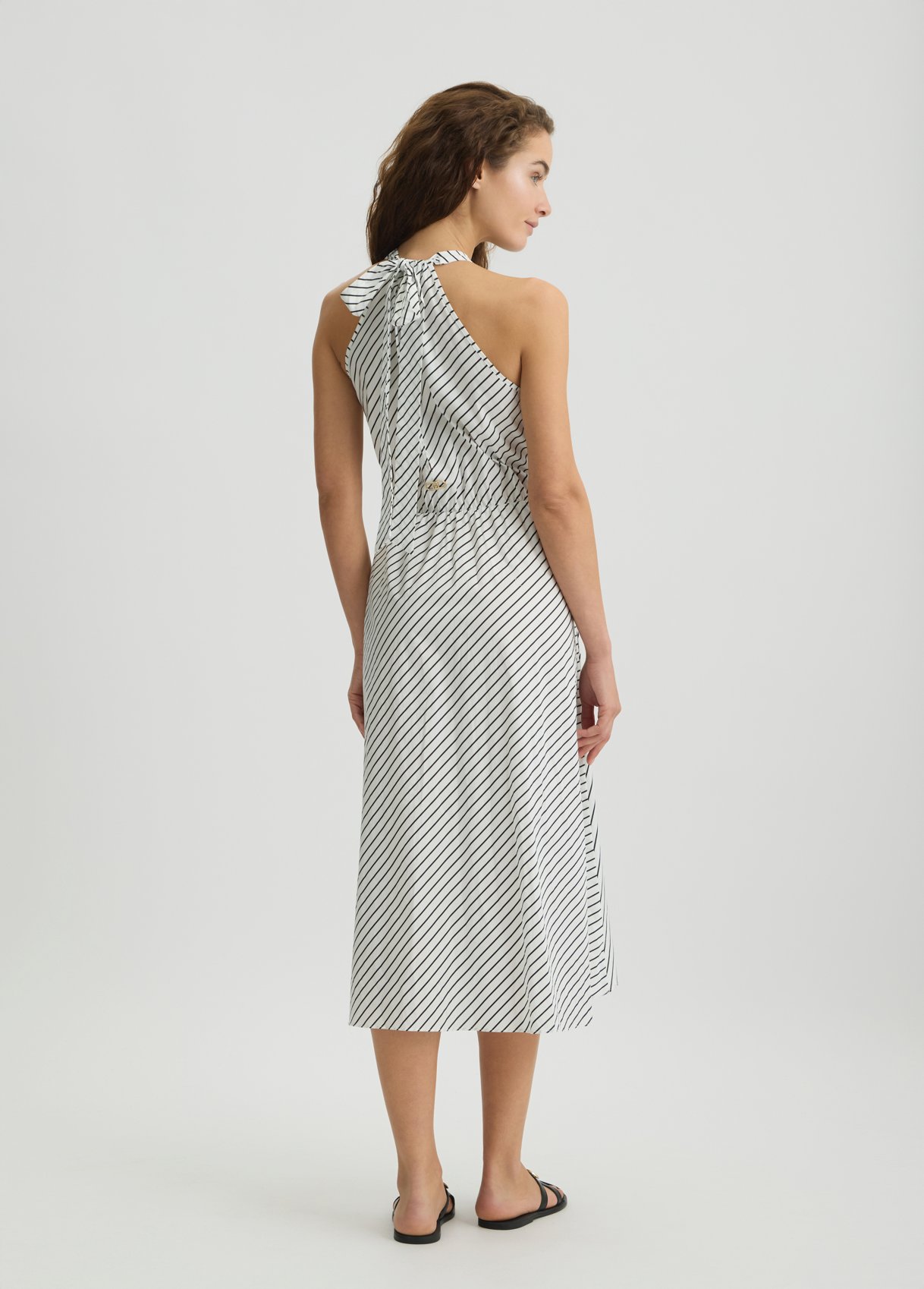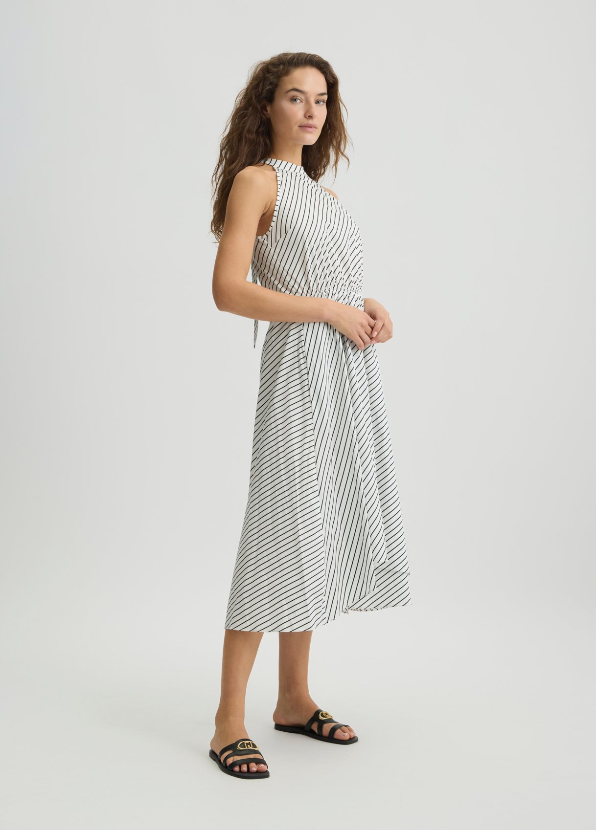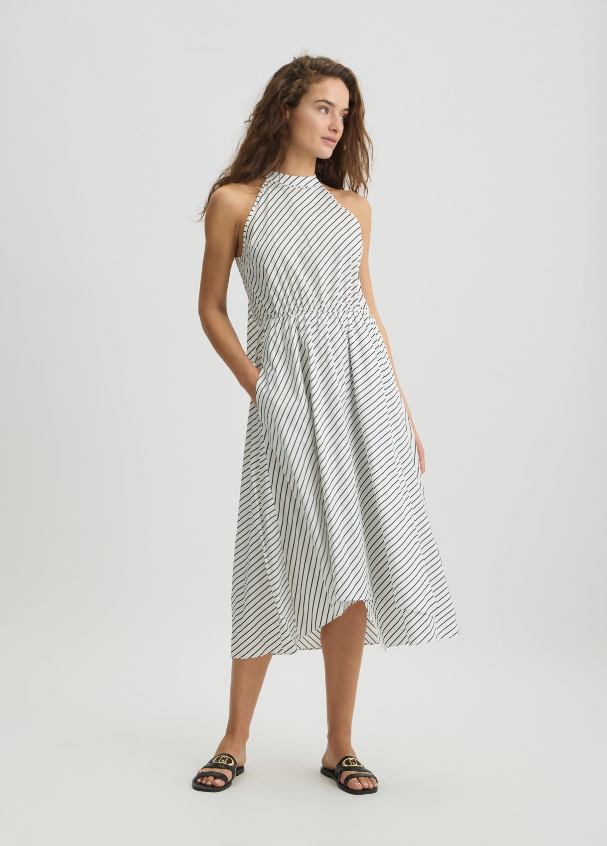 Descrizione: “Vestito lungo in popeline di cotone stretch Stampa a righe all over Scollo all’americana con fiocco sul retro Lettering LJ in metallo con strass sul retro La modella è alta 178 cm e indossa la taglia S Composizione: Tessuto principale: 97% Cotone, 3% Elastan “