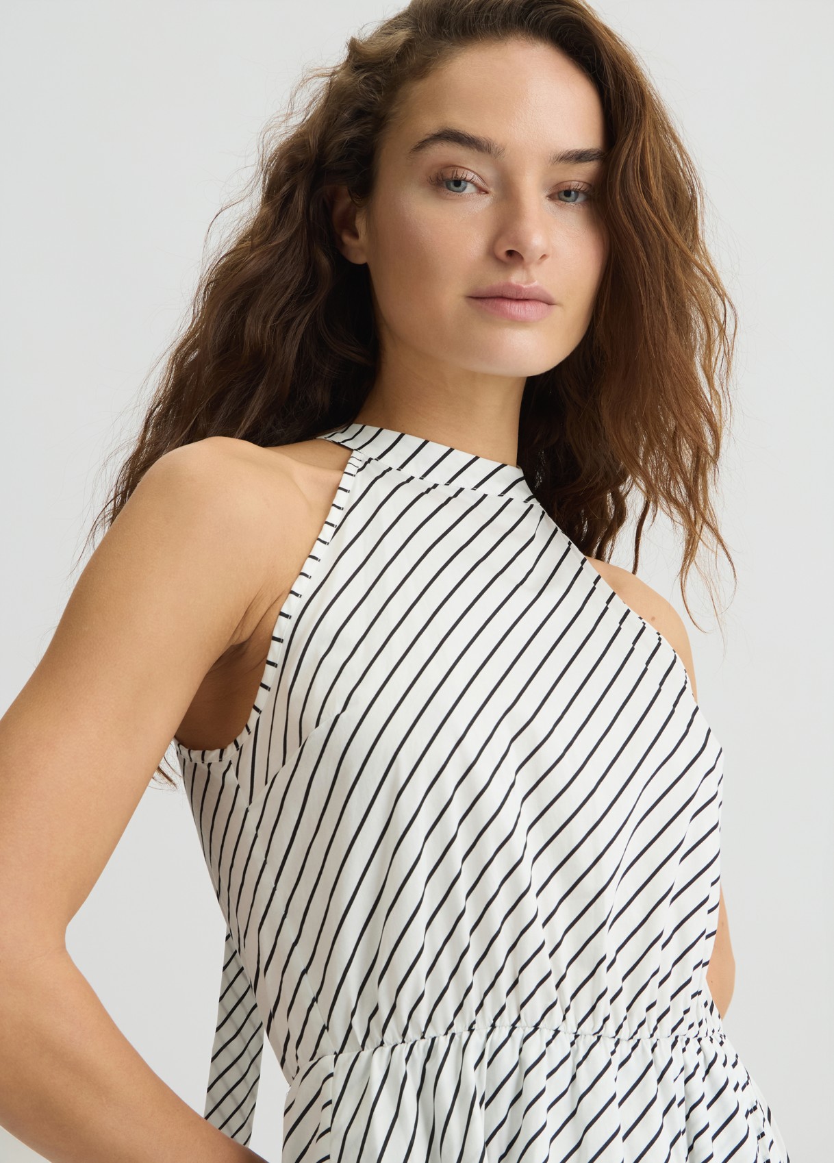 “Vestito lungo in popeline di cotone stretch Stampa a righe all over Scollo all’americana con fiocco sul retro Lettering LJ in metallo con strass sul retro La modella è alta 178 cm e indossa la taglia S Composizione: Tessuto principale: 97% Cotone, 3% Elastan “