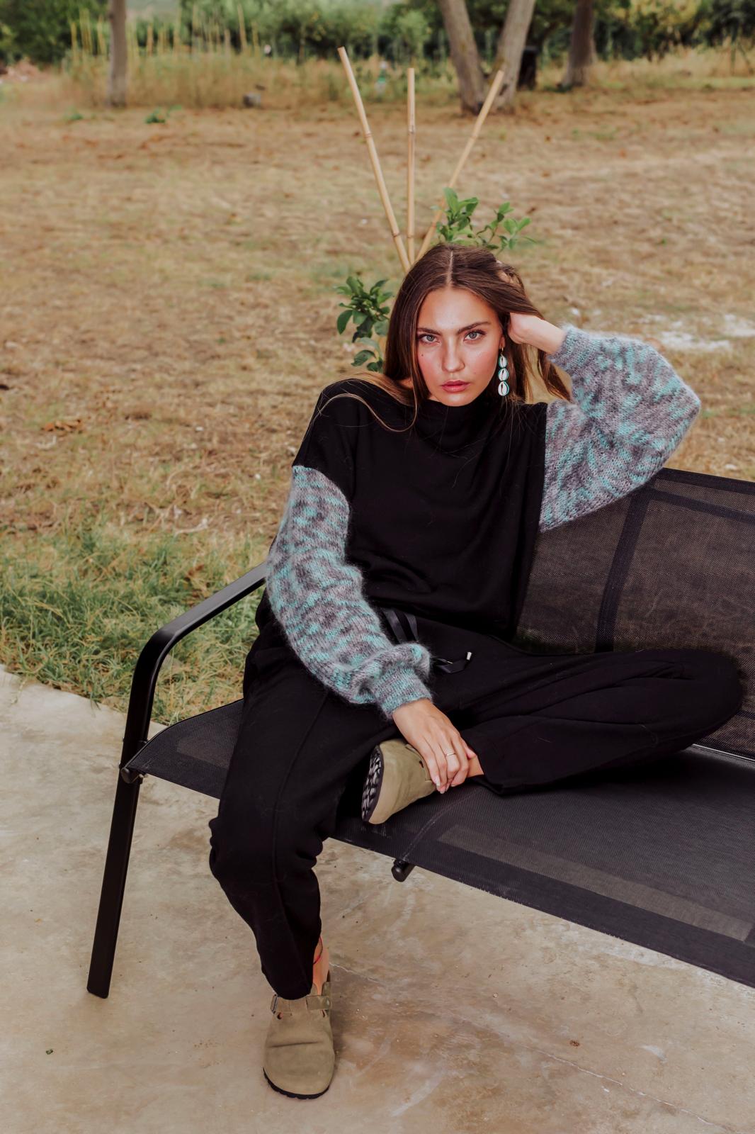 “Felpa in viscosa con maniche in lana lavorate a mano , da abbinare al pantalone Penelope 8”