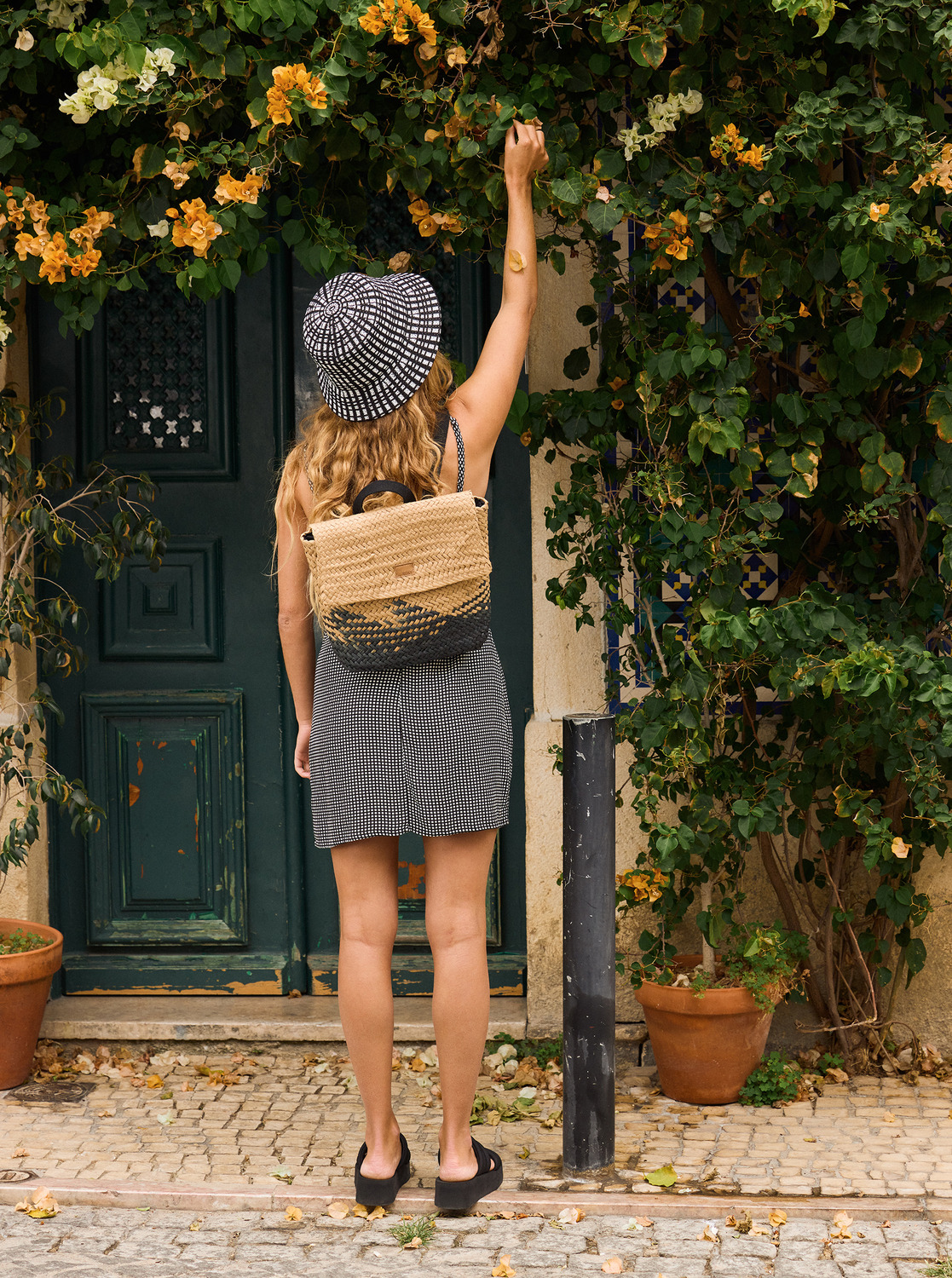 Descrizione: “Zaino di tessuto in carta con scomparto principale e spallacci regolabili.